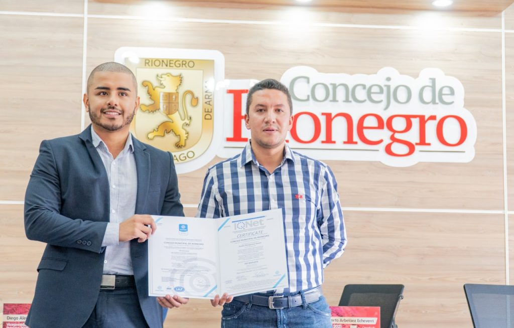 “Para Icontec es un honor ser aliado de el Concejo Municipal de Rionegro en la mejora continua a través de la auditoría y certificación de su sistema de gestión bajo la norma ISO 9001, y desde nuestro Consejo Directivo y Comité de Certificación, Icontec expresa su agradecimiento por haber confiado en la trayectoria y experiencia como ente de certificación en Colombia y como organismo de normalización” así comenzó el representante de Icontec David Molina su intervención, para posteriormente hacer entrega de la certificación de gestión de calidad al Concejo Municipal de Rionegro.